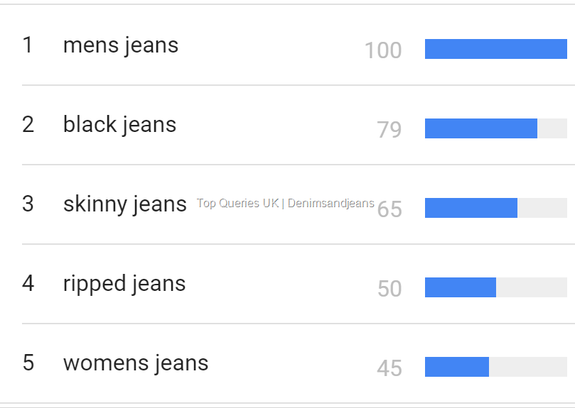 UK searches for the below mentioned keywords which are considered as Top Keywords people use to search for denim.