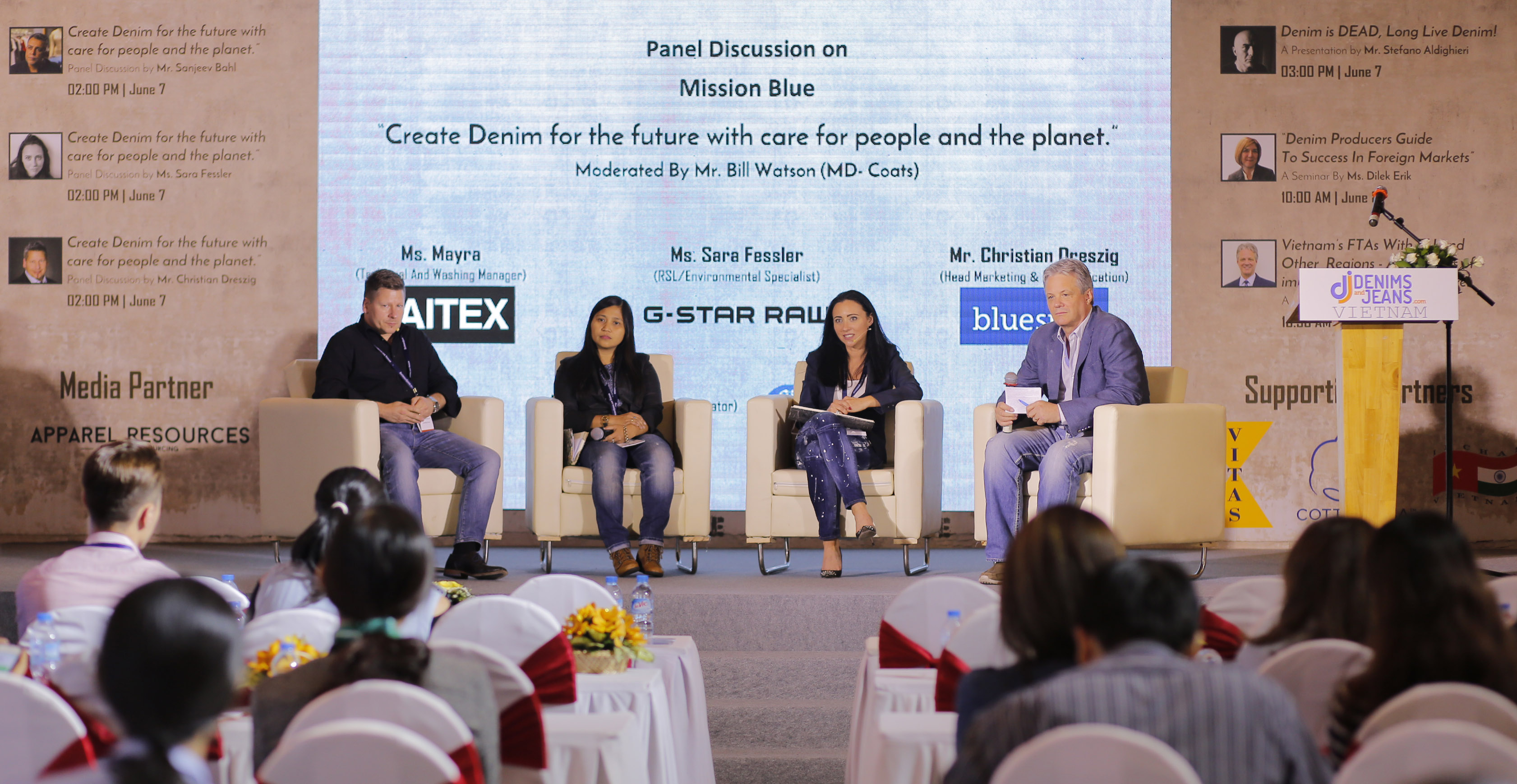 Continuing the tradition of focus on Sustainability,  the second edition of Denimsandjeans Vietnam witnessed a very important Panel Discussion :” Mission Blue- Create denim for the future with care for people and the planet “ on June 7 at the Gem Center , Ho Chi Minh City . The objective of the panel discussion  was to bring out the new initiatives G-Star is taking alongwith their partners to make their products much more sustainable. G-Star has already set a target to go use sustainable materials in all their products by 2020 and it was in this context that the presentations and talks by Sara Fressler ( G-Star) , Dreszig Christian ( Bluesign) and Myra Opena (Saitex) became very interesting for the denim community to attend or view. The panel discussion was moderated by Mr Bill Watson – the MD of Coats Vietnam.